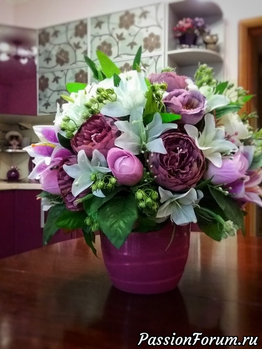 Приветствую Вас, дорогие рукодельницы! Хочу представить вам ещё один букет, который украшает мою кухню. Люблю я все оттенки фиолетового, потому и окружаю себя этим цветом.
