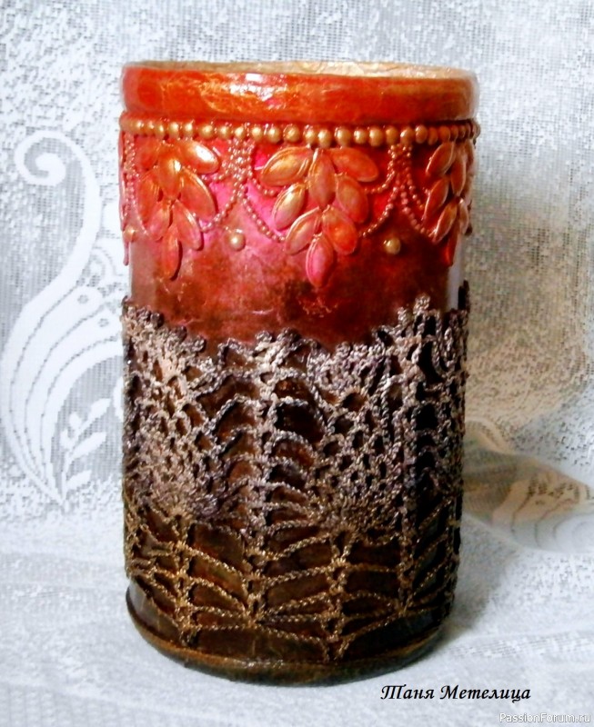 С чего всё началось... Уже продолжительное время творю подсвечники для чайных свечек. А тут заканчивается очередной пузырёк от пены для ванн, а форма у него такая интересная) Покрутила, повертела, дай думаю попробую... И попробовала на свою голову, теперь хомячу разные пузырьки, из которых можно сотворить вазочку. Размеры не большие, но букетик поставить можно. И водичку налить для живых цветов тоже можно. Готова к любой критике
