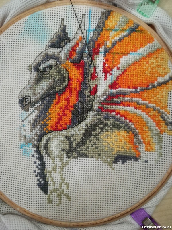 Я закохалася в цього Дракона як тільки побачила. Вибрала білу канву, До того ще не працювала з чорною і кольоровою канвою. А ще минулого літа, коли вишивала помилиласяі довелося розпустити голову повністю і грудинку теж. Я її в обкладинку вклала. Тепер в мене книга круто оформлена.