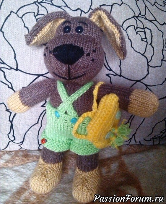 Добрый день, дорогие форумчане! Связался вот такой песик. Связан спицами, пряжа акрил, наполнитель синтепух гипоаллергенный. Рост Тимошки 30 см. Одежда и рюкзачок снимаются. Цена 1200 рублей + пересылка.