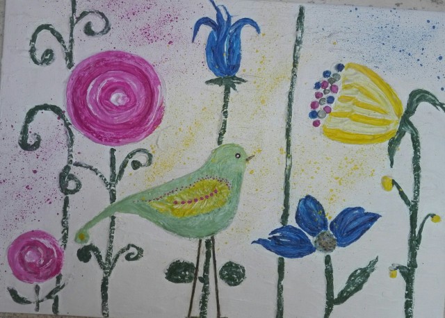 Фантазийный сюжет выполнен на двух плитках из фанеры с применением шпатлевки клея пва, акриловых красок и лака.