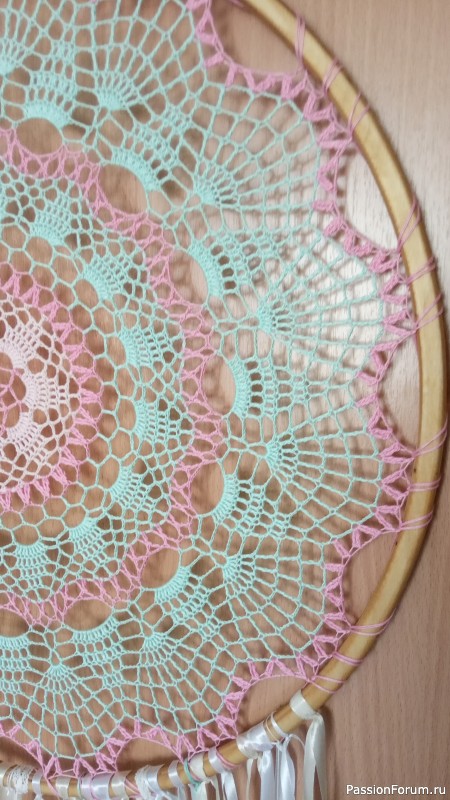 Ловец снов выполнен из кружевной салфетки. Декорирован бусинами, атласными лентами, перьями. Размер 55*110см.