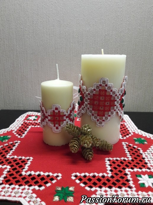 Здравствуйте, дорогие мои соратницы-рукодельницы! Долго сомневалась, публиковать ли этот пост. Уж очень всё просто....Но есть повод - предстоящие новогодние и рождественские праздники. Может быть кого-нибудь вдохновит;)) Рождественскую Викторианскую шила на Лугане красивого насыщенного винного цвета, поэтому рука не поднимается выбросить даже самый маленький лоскуток. Давно собиралась украсить свечу поясочком, известным рукодельницам из рассылок Pinterest'а. Многие его уже шили. Вышить-то вышила, но...