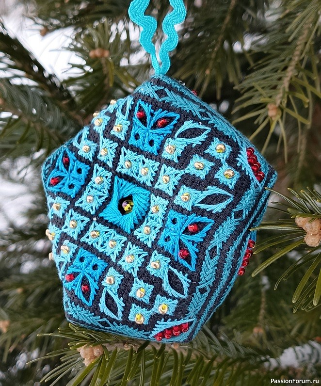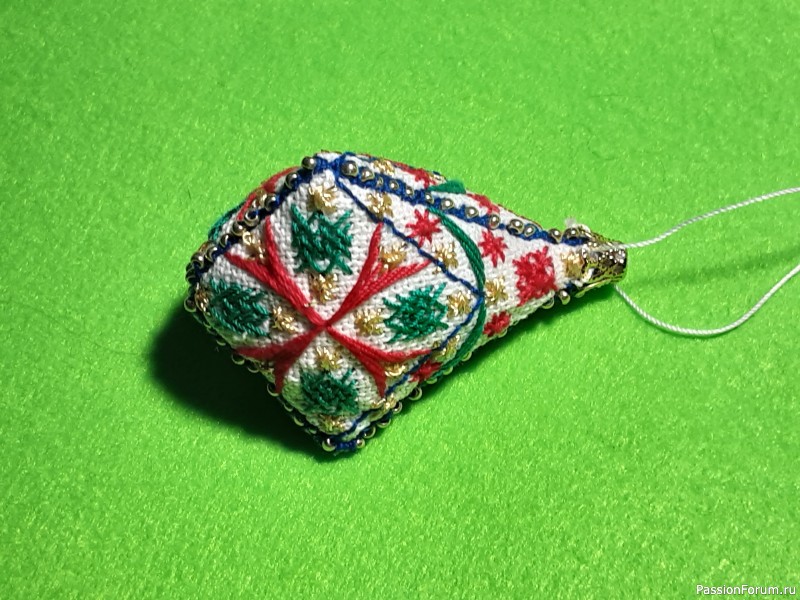 Не знаю что у меня получилось: или сосулька, или капелька. Еще их называют кривульками, может быть. Маленькое, блестящее елочное украшение. Это уже декоративные шовчики. У меня три стороны, а можно было вышить и четыре, и пять. Увидела в ВК в свободном доступе, дизайн Марины Новиковой.