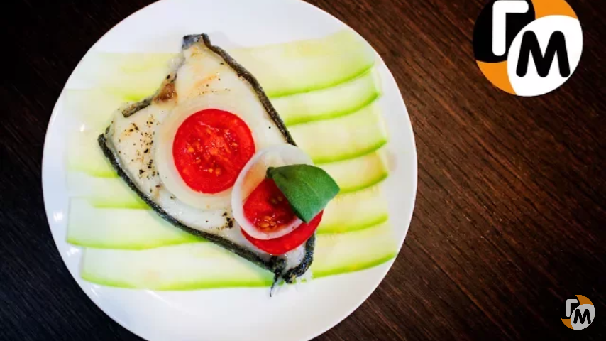 Готовить эту рыбу нужно, как только она разморозится. Сама она водянистая, а нам не нужно, чтобы весь сок вытек раньше времени. Филе или стейк избавляем от лишнего, промокнем бумажным полотенцем. Нарезаем лук, помидоры.