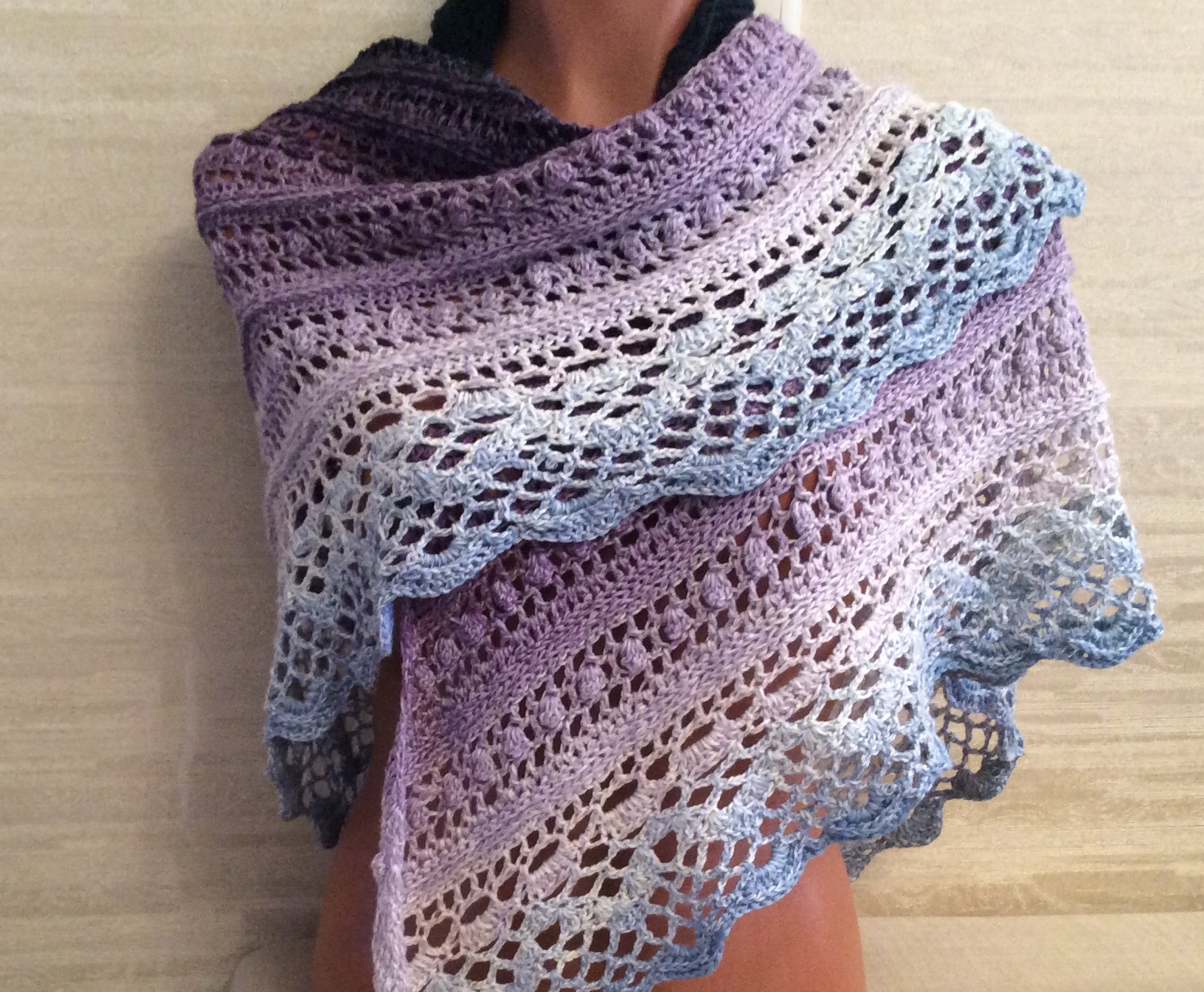 На этот раз получилась вот такая небольшая шалька Черничка. Размер в размахе 150 см, высота по средней линии 85 см.