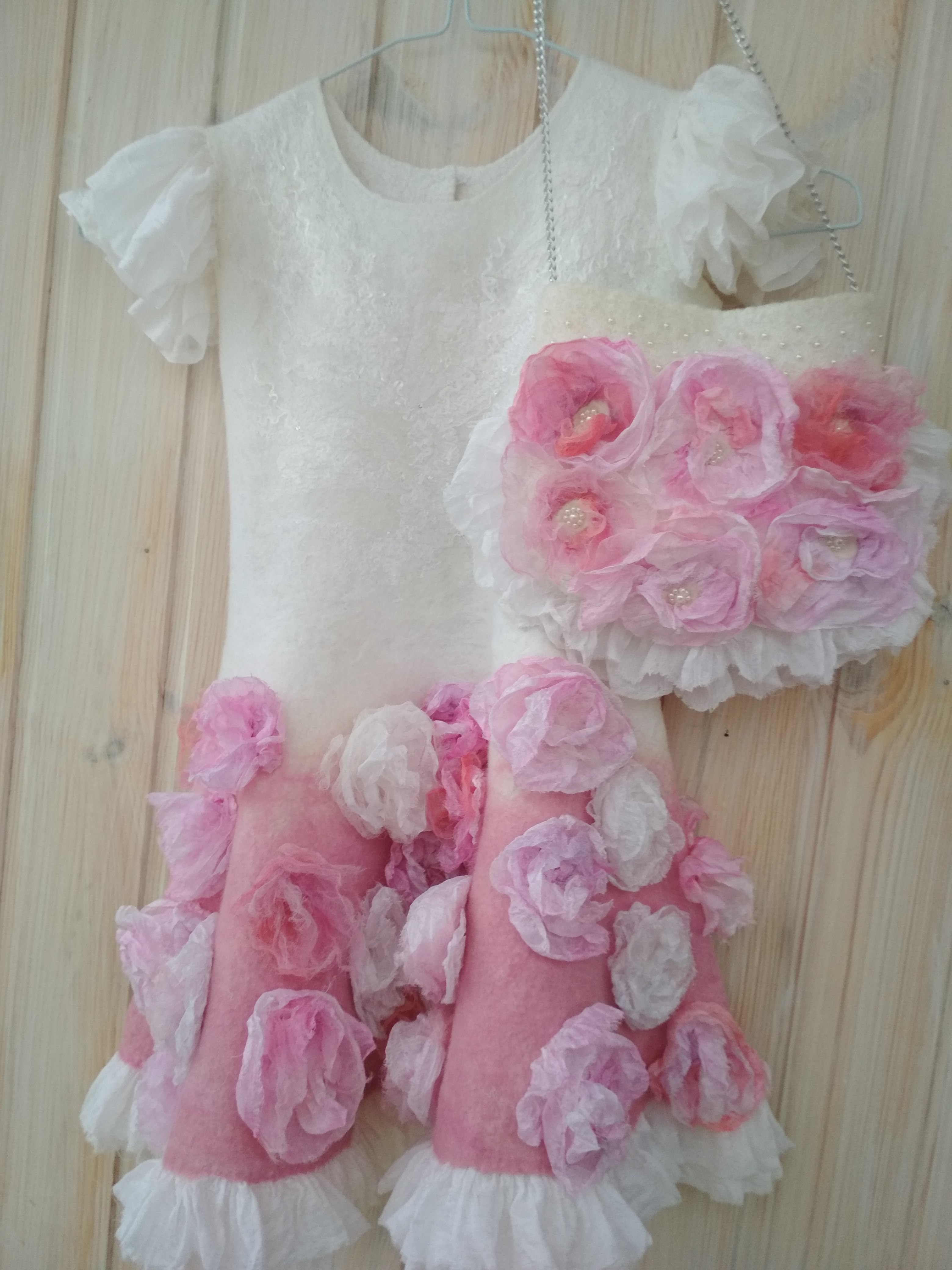 К сожалению, пока внуков нет, а так хотелось сделать детское платье, вот так и был рожден этот комплект. Сейчас думаю кому бы его пристроить.