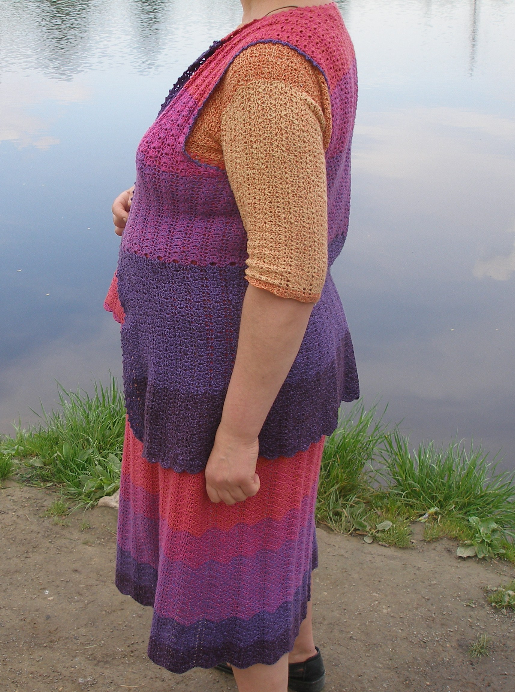 Здравия, многолетия и творческих успехов всем рукодельницам! А я хочу представить еще одну вещь (то есть, три в одном, как в рекламе), собственноручно изготовленную, поскольку "в тени" сложа руки не сидела. Пряжи у меня запас большой, как говорится, вяжи не хочу. Вот я и вяжу потихоньку. На этот раз вольная фантазия без темы, сначала купила понравившиеся нитки, а потом под них все сложилось. Ну, все, больше не буду соловья баснями кормить, а покажу то, что у меня получилось. Вот: