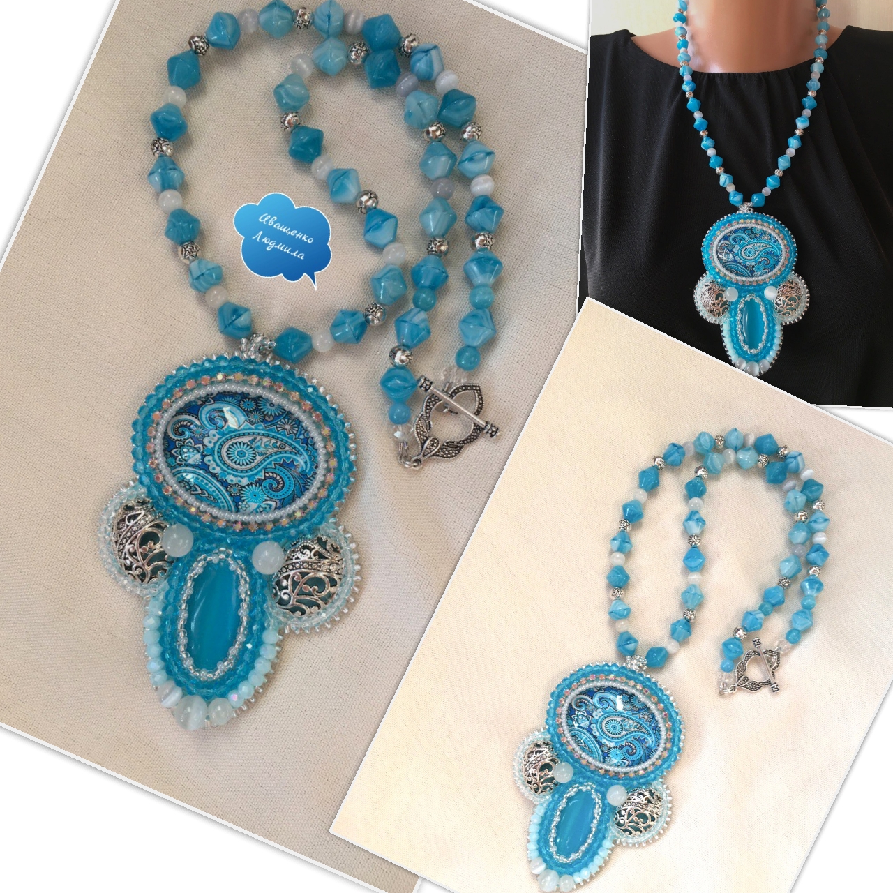 Украшение изготовлено из множества материалов,кабошон и бусины кошачьего глаза,стеклянный кабошон с турецкими огурчиками ,чешские и австрийские бусины,фурнитура и..,,Длина кулона 9см,бусы 51см.