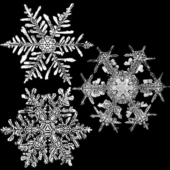 Снежинка - один из самых фантастических примеров самоорганизации материи из простого в сложное. На Крайнем Севере снег бывает настолько твёрдым, что топор при ударе по нему звенит, словно ударили по железу. Предполагается, что в одном кубическом метре снега находится 350 миллионов снежинок, каждая из которых уникальна. Не бывает пятиугольный или семиугольных снежинок, все они имеют строго шестиугольную форму.