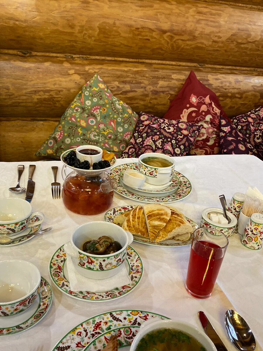 Клюквенный морс. Чай ягодный. К чаю подали малиновое варенье, чернослив и курагу. Очень вкусно.