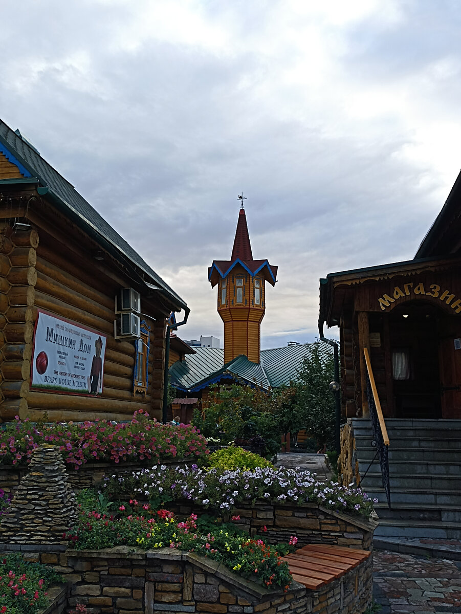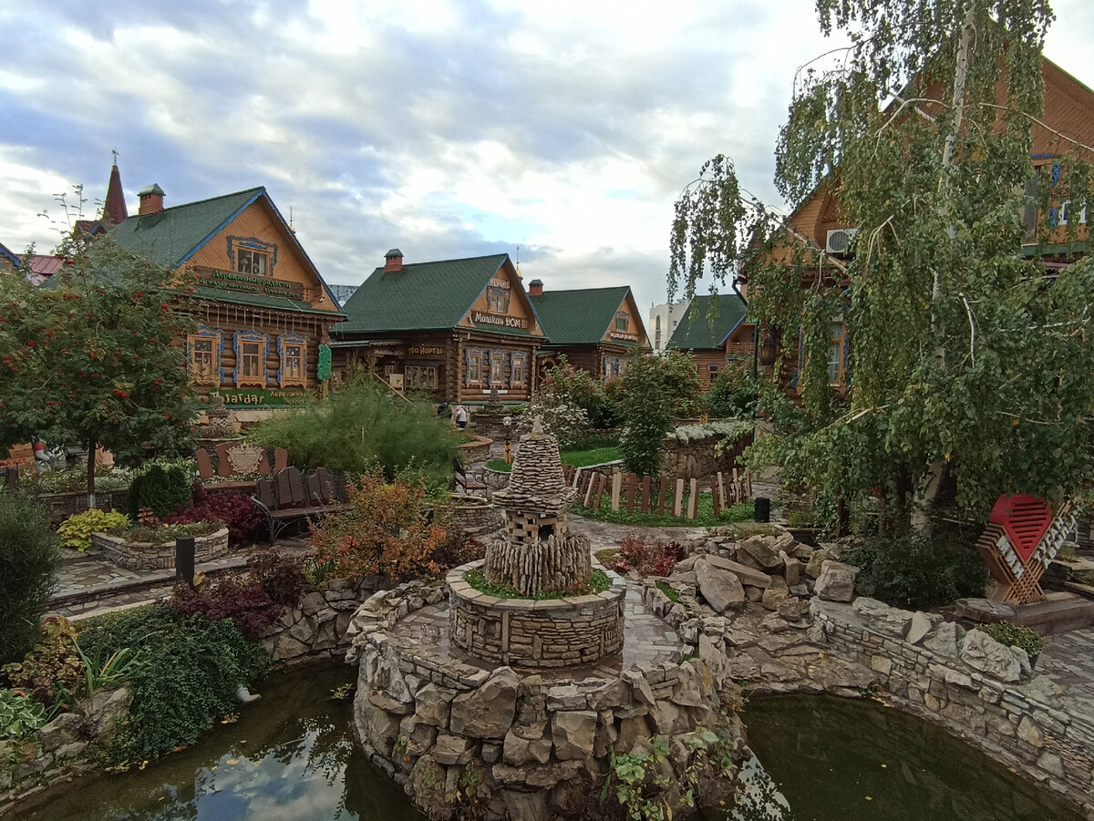 Когда мы были на экскурсии "Огни ночной Казани", то гуляли по интересному месту - национальному комплексу "Туган Авылым". Располагается он через дорогу от театра кукол "Экият". На территории комплекса несколько кафе, ресторан, действующая баня, магазины серебра, сувениров, прогулочная зона с интересными скульптурами, небольшой пруд с рыбками. Мы решили пообедать в ресторане " Туган Авылым" с блюдами татарской кухни. Но сразу мы его название не запомнили и дорогу к комплексу тоже, поэтому дочка в 2гис на телефоне забила памятник эчпочмаку, который находится в этом месте, и пошли туда от озера по навигатору)