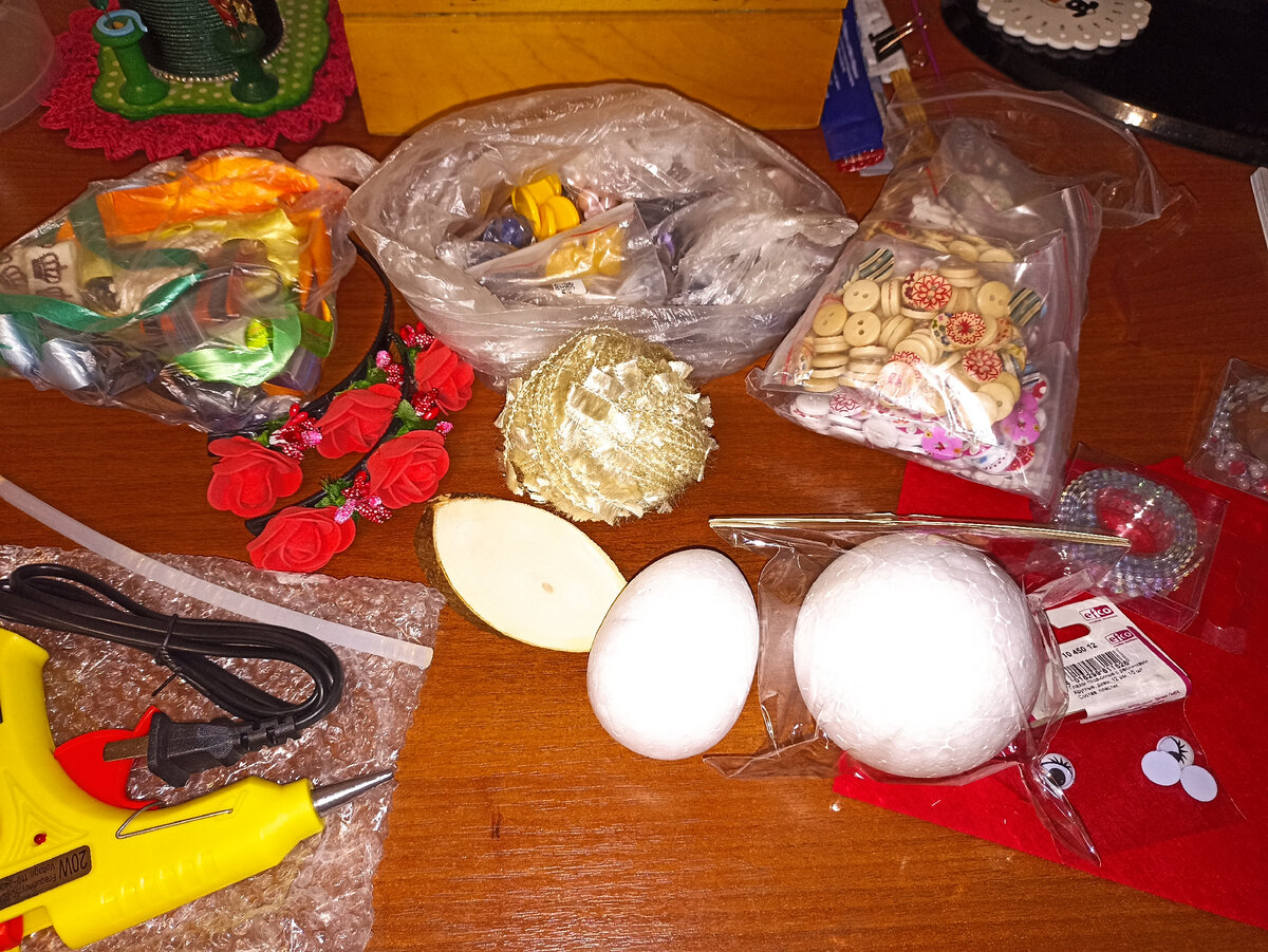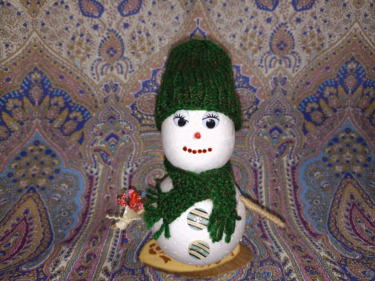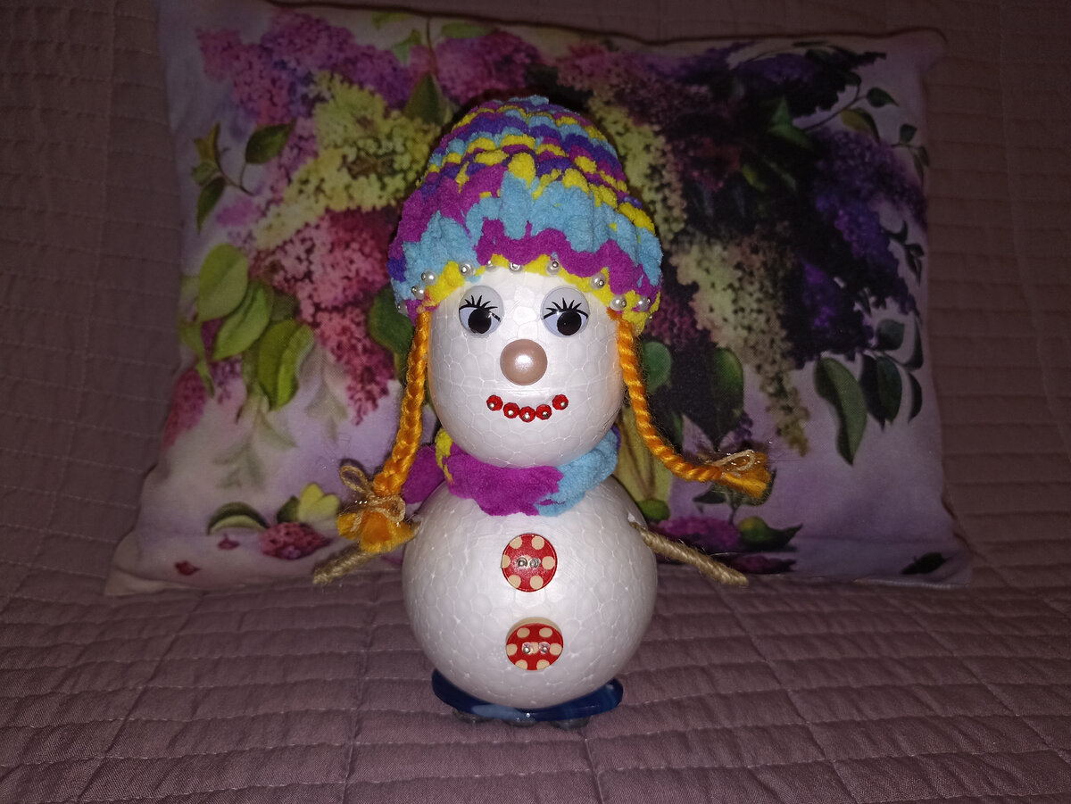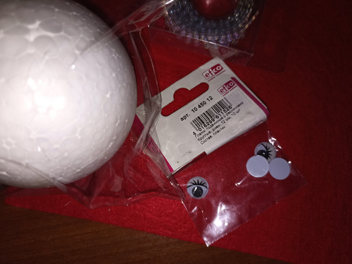 Снеговик молодой, вчера сотворился, сегодня нарядился. Расскажу, как это произошло: пришла я вечером с работы домой, порылась в рукодельных материалах, вытащила на стол пенопластовые шары, пряжу, пуговицы, глазки для куколок и другое. Хотела испробовать в работе новый клеевой пистолет, но не судьба - вилка не такая (с плоскими штырями), нужно покупать переходник. Пришлось пользоваться где-то клеем Момент прозрачным, где-то двусторонним прозрачным скотчем. Вы, пожалуйста, Моментом не пользуйтесь, так как он разъедает пенопласт на раз-два (видите - носик провалился?) Нужен клеевой пистолет и точка.
