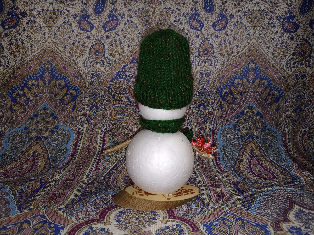 К туловищу приклеиваю две пуговицы. Приклеиваю игрушку на подставку (у меня срез дерева). Всё, осталось нарядить молодого человека в шарфик и шапку. Пряжа у меня зелёная с люрексом, спицы 2.5. Связала шарфик на пяти петлях, шапочку на 40 петлях, делая иногда убавки.