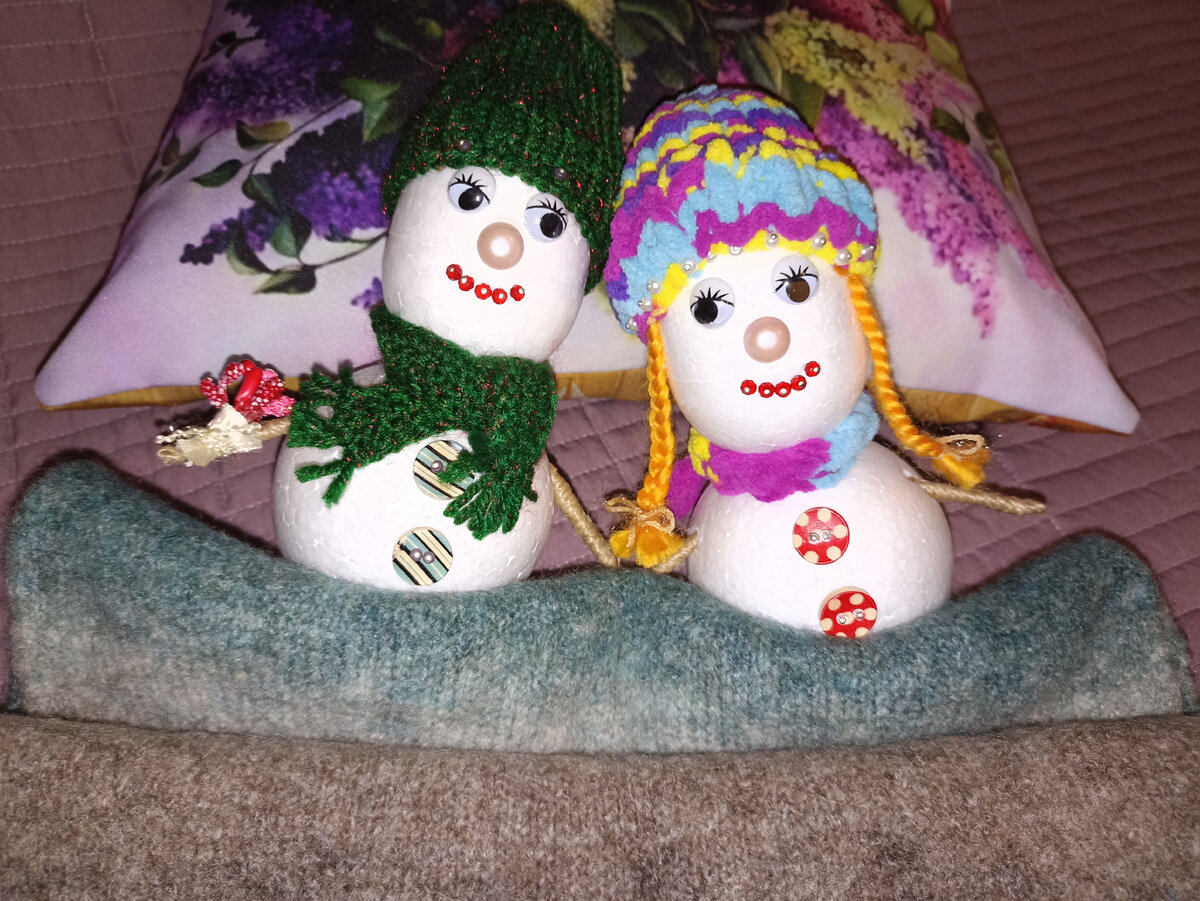 Подружку Снеговика создавала таким же образом. Затем сплела ей косички из толстой пряжи, приклеила к голове с помощью клеевого пистолета, сверху надела вязаную шапочку. Снеговиков для устойчивости приклеила к подставкам: у мальчика деревянный брусок, у девочки плоский камень от кулона.