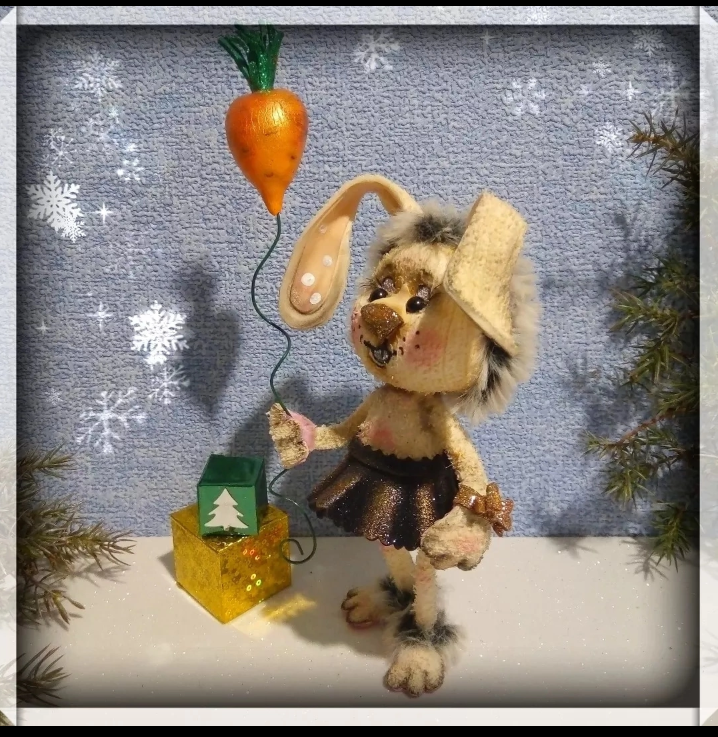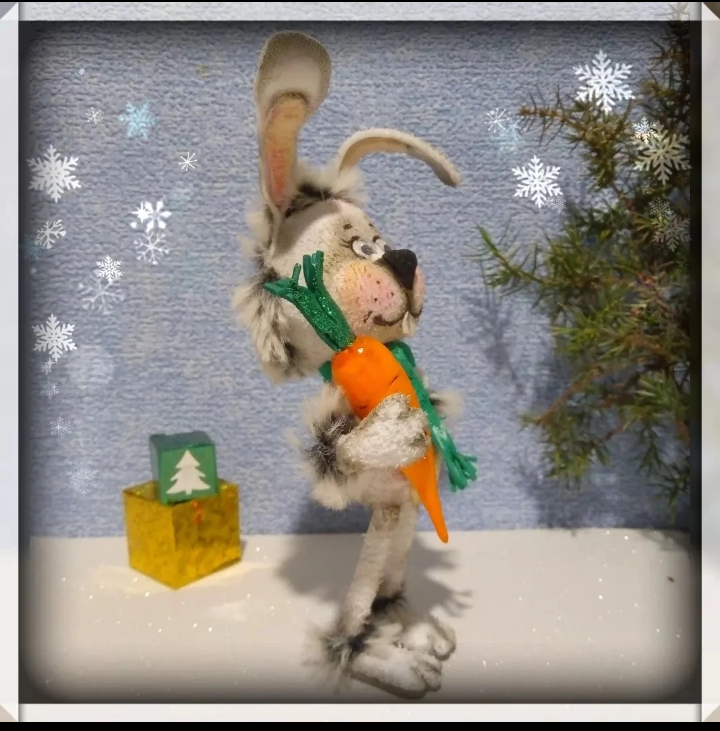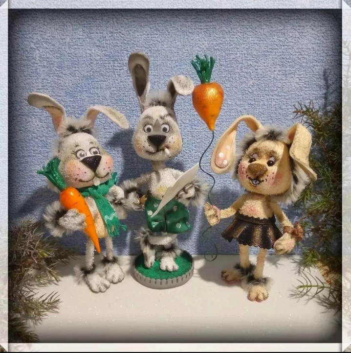 В продолжение Предновогодней темы родились три новых зайца-кролика.Они совсем небольшие,16-19 см. в высоту. Но ,как видите,абсолютно разные по характеру !Они тоже из фоамирана и немного пушистой пряжи.