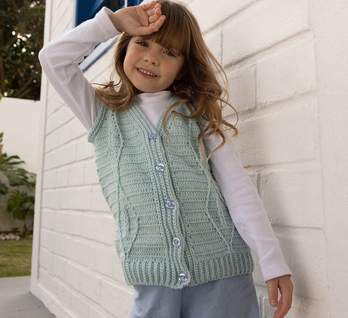 Отделка. Сшейте плечевые швы. Обвяжите проймы пятью рядами лицевых рельефных столбиков с накидом. Вяжите по переду (включая планку) и горловине 8 рядов лицевых рельефных столбиков с накидом. На правой полочке в 6-м ряду сделайте 5 отверстий для пуговиц (2 воздушные петли, пропустить 2 столбика из предыдущего ряда; в следующем ряду провяжите 2 лицевых рельефных столбика с накидом в эти 2 воздушные петли). Между отверстиями 10 петель. На левой полочке пришейте пуговицы.
