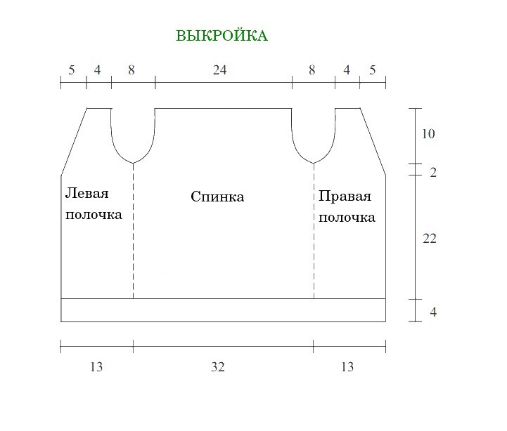 ОПИСАНИЕ. Перед и спинка сначала вяжутся сразу вместе. Начните с горизонтальной планки. Сделайте цепочку из 10 воздушных петель + 1 петля для поворота и вяжите лицевыми рельефными столбиками с накидом. Через 58 см от начала работы вяжите по одной длинной стороне следующим образом: 26 петель основного узора (правая полочка), 92 петли (спинка) и 26 петель (левая полочка). Через 22 см от планки для выреза горловины после кромочной оставьте непровязанными по одной петле в каждом ряду 12 раз. А через 24 см от планки для пройм отделите на спинке центральные 80 петель и вяжите каждую сторону раздельно. Правая полочка. Продолжайте убавки для горловины, при этом для проймы в каждом ряду убавьте 4 петли, 3 петли и 2 петли. Через 34 см полочка готова. Левую полочку вяжите зеркально. Спинка. Сделайте убавки для пройм как на полочках.