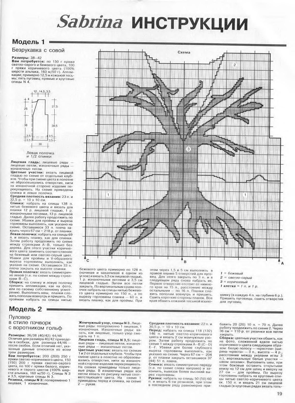 Журнал Sabrina - самый популярный в Европе журнал по вязанию. Все модели - женские, мужские, детские - всегда на пике моды, подходят для людей любого возраста и на все случаи жизни. В каждом номере более 30 моделей с инструкциями, схемами и выкройками. Широко представлена молодежная тема, отдельная тема журнала - экстравагантные модели для тех, кто это любит. В каждом номере наряду с моделями, связанными на спицах, представлены и вещи, связанные крючком.