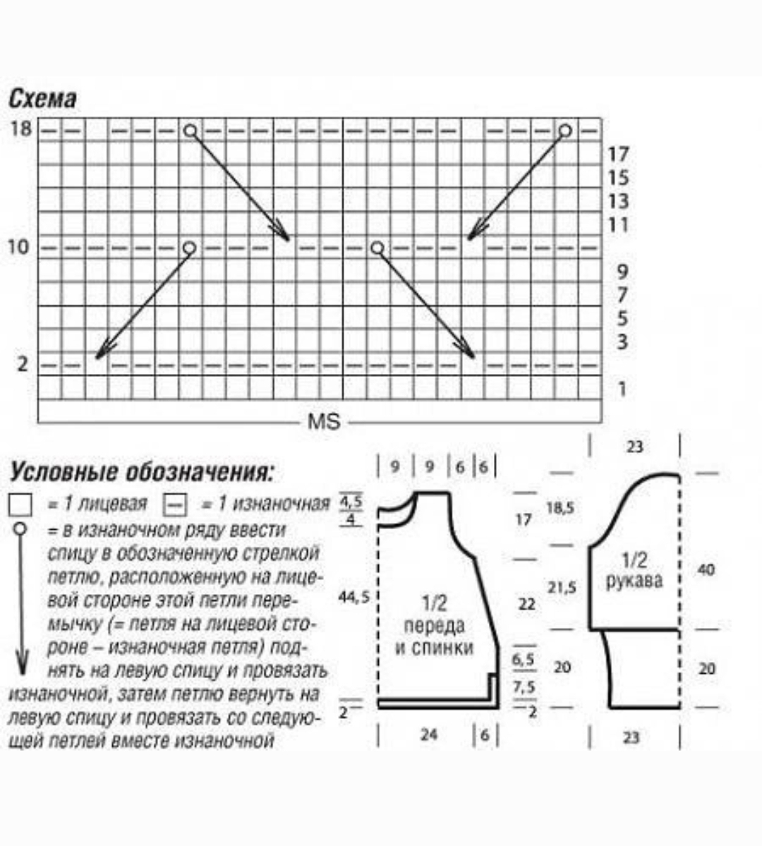 Перед: вязать, как спинку, но для более глубокой горловины уже через 44.5 см = 116 рядов от планки закрыть средние 15 п., затем для округления по внутреннему краю подчеркнуто убавить в каждом 6-м ряду 2 х 2 п., при этом выполнять подчеркнутые убавки А.