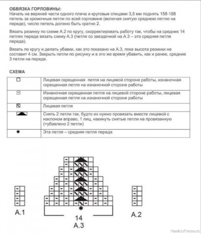 Вязать резинку по схеме А.2 по кругу, скорректировать работу так, чтобы на средних 14 петлях переда вязать схему А.3 (петля со звездочкой на А.3 – это средняя петля переда).