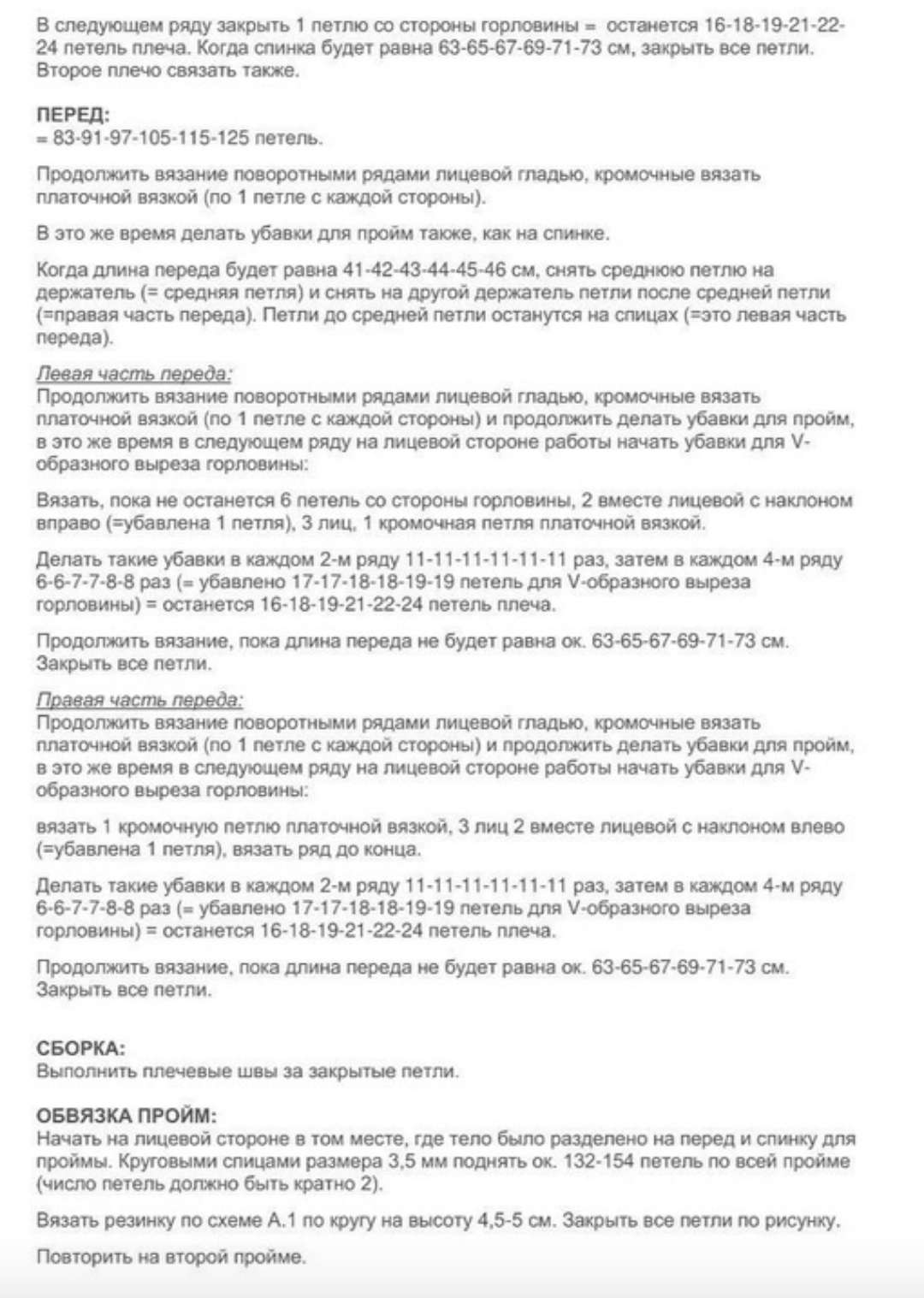 Продолжить вязание, пока длина переда не будет равна ок. 63-65-67-69-71-73 см. Закрыть все петли.