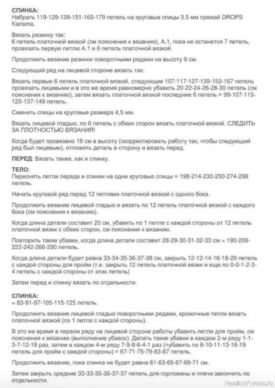 Переснять петли переда и спинки на одни круговые спицы = 198-214-230-250-274-298 петель.