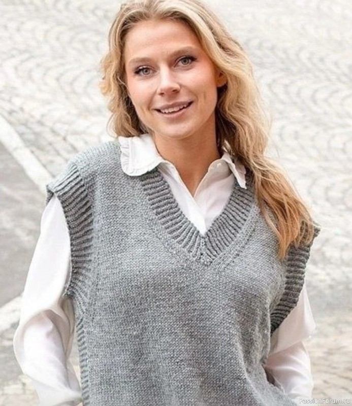 Когда будет провязано 18 см в высоту (скорректировать работу так, чтобы следующий ряд был лицевым), отложить деталь в сторону и вязать перед.
