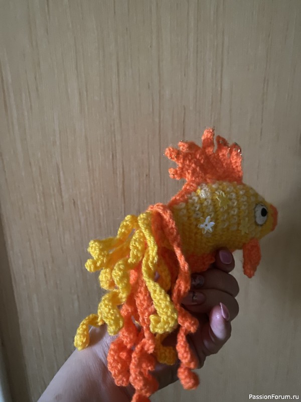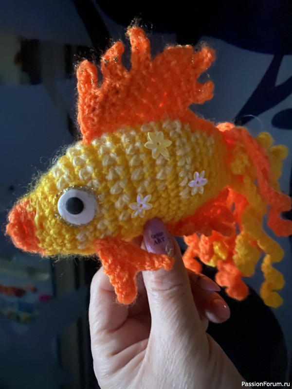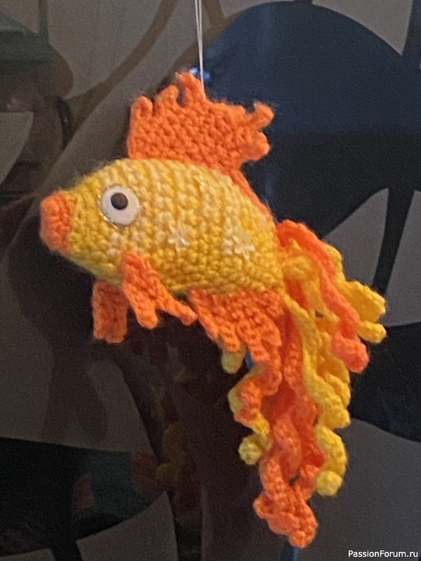 Все началось с рыбки оранжевого цвета. Мне нужно было сотворить что-то оранжевое . Рыбка получилась сразу без капризов, хоть по схемам я не вяжу, т.е. был полный экспромт. Потом позже я покажу и ту первую рыбку. Я назвала ее рыбкой исполнения желаний. Пришла подружка, увидела рыбку и сказала, что ей просто необходима рыбка, исполняющая желания! Вязать повторы. - вообще не мое! Я даже рукава с трудом вяжу, потому что нужно два раза делать одно и то же! Но у подружки случился ДР! Поэтому, я решила связать ей золотую рыбку. Всем известно, что золотые точно выполняют желания! И это был тоже полный экспромт! Три разные пряжи: акрил ярко-желтый и оранжевый и немного бледно-желтой полушерсти. Несколько пайеток-цвнточков. И рыбка готова!