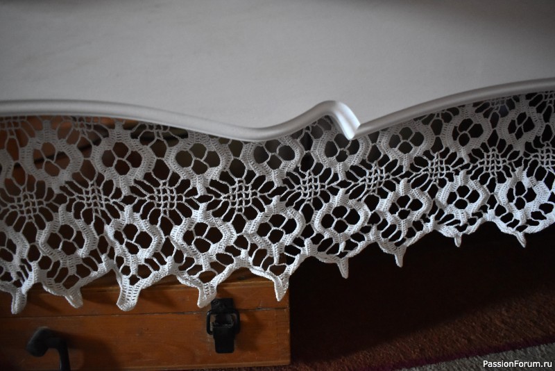 Думаю, что заготовка для подзора или для украшения полотенца. Первоначально использовала его для декора своего выпускного платья в 10 классе. Носила и в студенчестве, и выйдя замуж. Со временем кружево начало желтеть, пришлось долго его реанимировать. Отбеленным дополнила платье и сарафан дочки для детского сада.