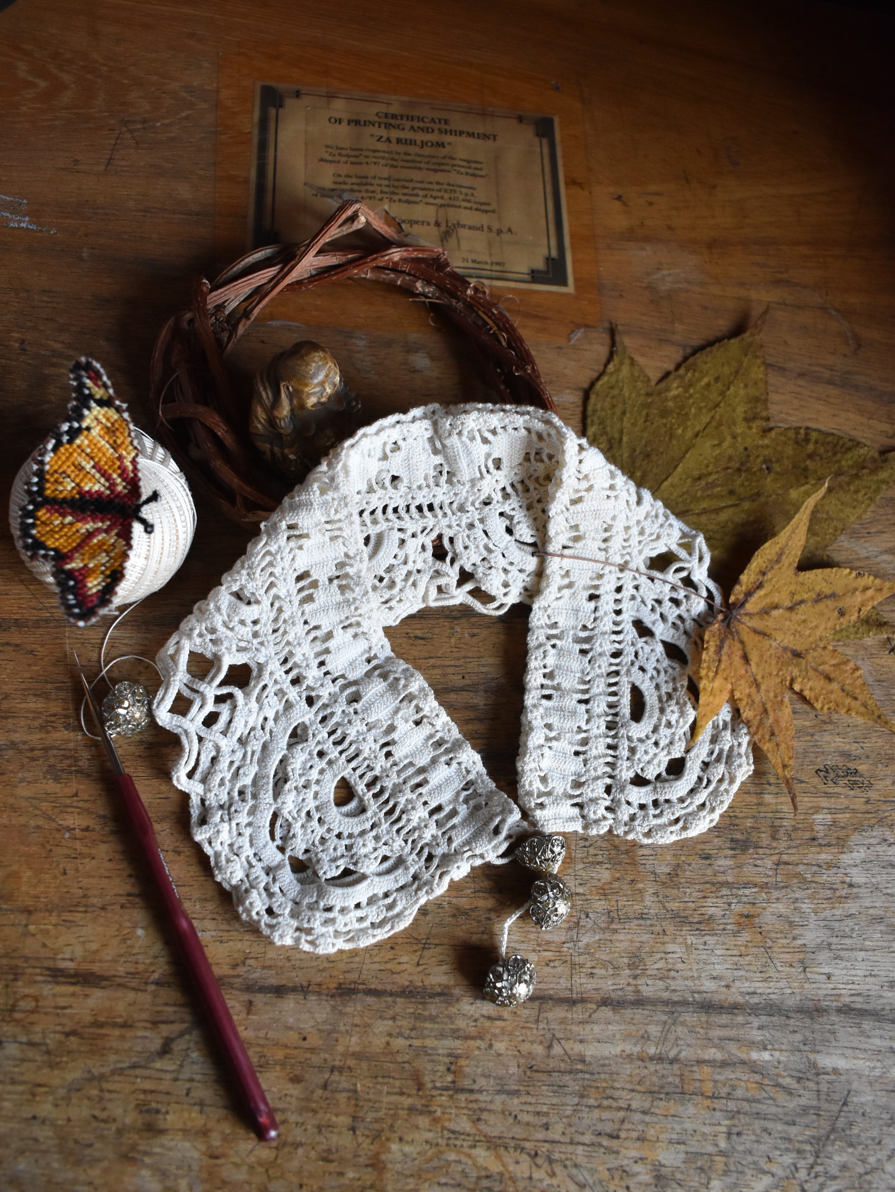 Кружевной воротничок (похоже это была заготовка для отделки подушки-думочки) сделала съемным, а регулировать будут металлические пуговки.