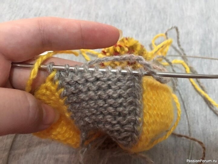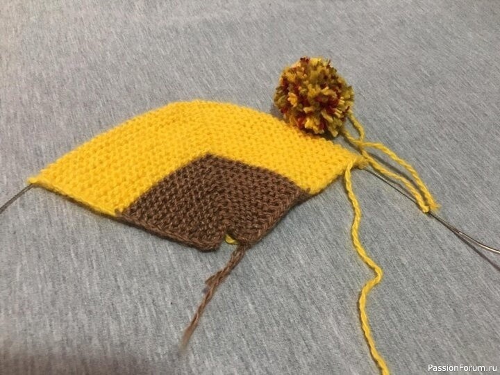 Далее перехожу на желтый цвет.Так же прибавления делаем в каждом лицевом ряду пока на петлях не будет 53 петель.