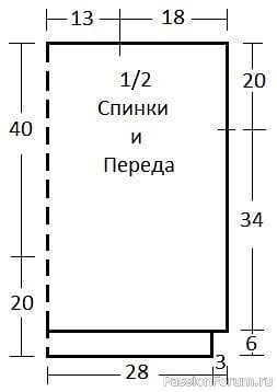 На высоте 40 см от начального ряда, с обеих сторон вязания установить маркеры, отмечающие начало линии пройм. Затем продолжить работу прямо. На высоте 60 см от наборного ряда, закрыть все петли по рисунку.