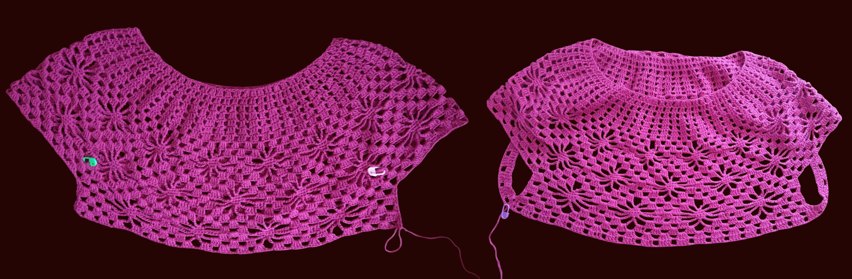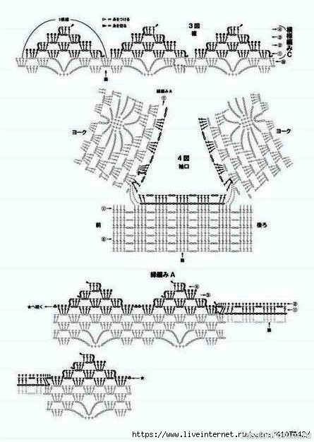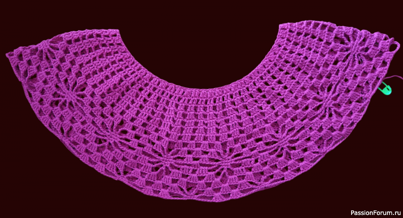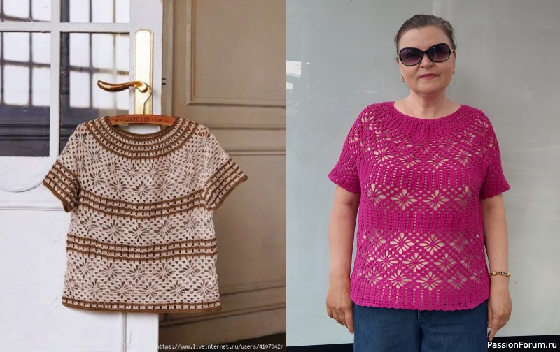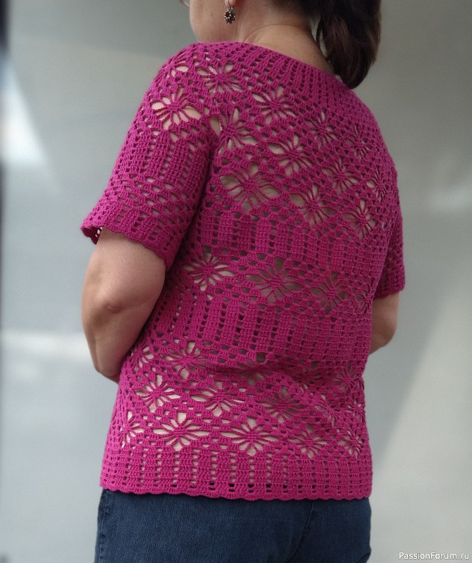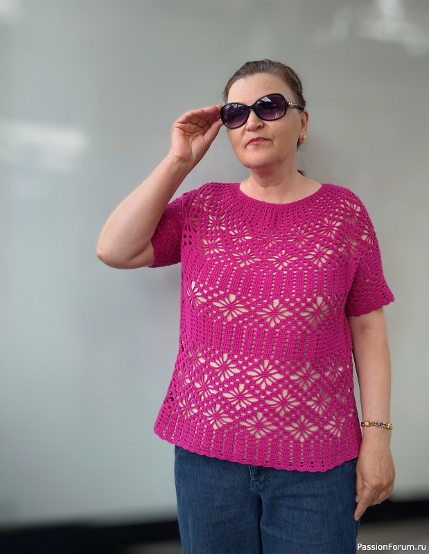 Блуза с круглой кокеткой, узор "паучки", крючком.
