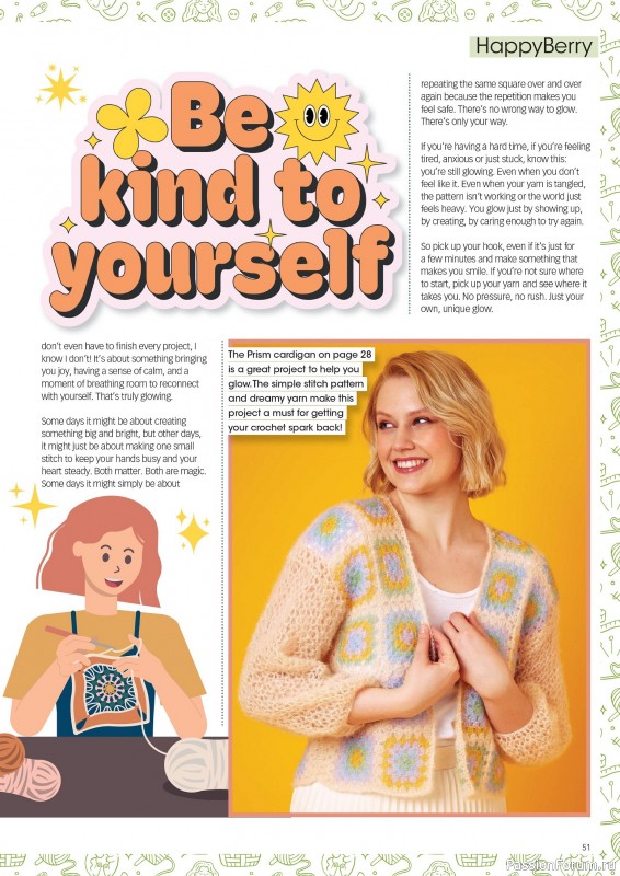 Журнал по вязанию крючком оригинальных и ярких моделей. Журнал для тех, кто хочет выглядеть стильно и оригинально и сделать уютнее свой дом. В номере модели одежды и аксессуаров для детей и взрослых, забавные игрушки, подушки, салфетки, коврики, уютные пледы и многое другое.