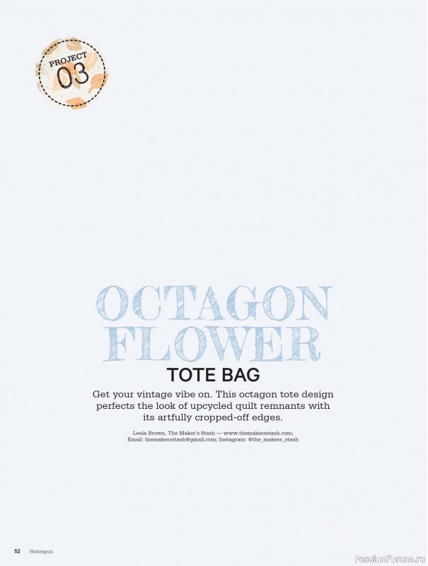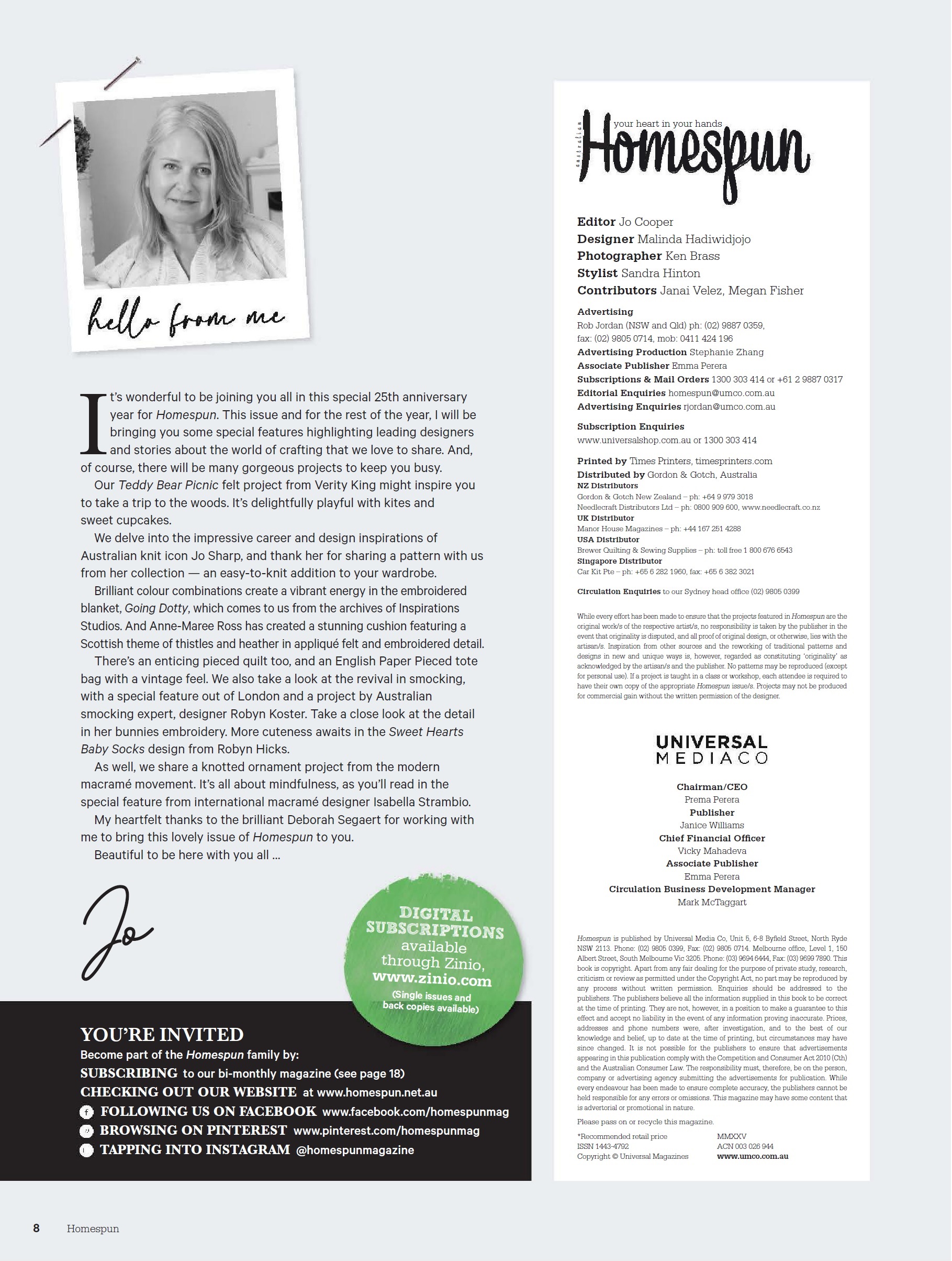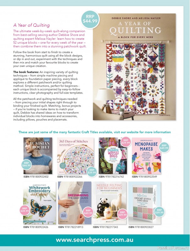 Журнал из Австралии посвящен рукоделию. Новый выпуск заполнен огромным количеством проектов увлеченных мастеров и дизайнеров со всей Австралии и мира. Творчески сочетая темы, стили и техники, мы каждый месяц дарим вам потрясающее вдохновение для пэчворка, аппликаций, вышивки, вязания крючком, спицами и игрушек.