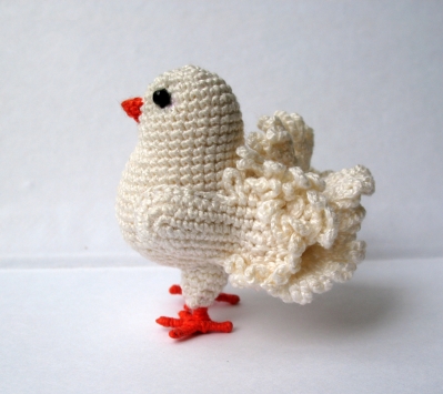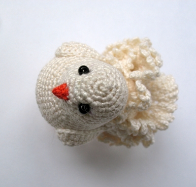 Высота с лапами 5 см. Лапки согнуты из медной проволоки и обмотаны «Ирисом» на клей ПВА. Туловище тоже из «Ириса» вязала. Клюв не вязала, а как бы «надстроила» несколькими стежками вязальной нитки, а потом утянула и прошила тонкой швейной ниткой, придавая форму.