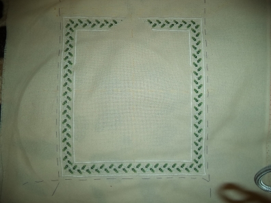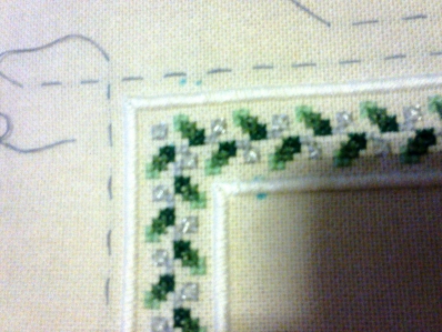 Вот так.Далее начинаем вышивать внешнюю сторону рамочки от центра по горизонтали,нитками pearl cotton №8(цвет белый),или вышиваем аналогичными ниточками (100% мерсеризованный хлопок).