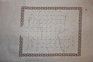 Отступив от края ткани 5-9см ,прошиваем контрастной ниткой будущий контур нашего домика по горизонтали .Находим середину и вверх так же прокладываем контрастную ниточку.За тем по горизонтали откладываем от центра 134 ниточки вправо ,134 ниточки влево и прошиваем контрастной ниточкой вверх. За тем от полученных точек по вертикали откладываем 155 ниточек и от этой точки вверх еще 145 ниточек и также прошиваем контрастной ниточкой .За тем вверх откладываем еще 10 ниточек ,это будет верх крыши дома.
