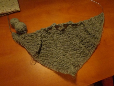 Добрый вечер! Вот мой отчет, пряжа ализа реал, спицы 2,5 мм.Не хочу, чтобы шаль была большой.Там в стороне небольшой кусочек вязания, он оторвался, когда распускала второй раз и горбик тоже на нем.Фото у меня получается не очень четкое, прошу прощения.Правда у меня все же есть сомнение, что шаль получится серповидной.Все же попытаюсь довязать до конца.