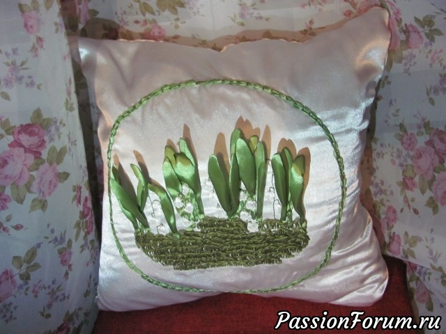 Добрый день, дорогие форумчамки! Представляю на Ваш суд свою работу - наволочку "Ландыши". Давно мечтала вышить лентами эти прекрасные цветы, а когда увидела этот замечательный конкурс, то это еще больше меня стимулировало на создание наволочки!