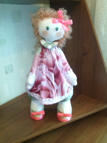 Это мой самый первый опыт в пошиве кукол. До этого я никогда не шила кукол. Волосы у куклы сделаны из атласной ленты. Глазки из фотобумаги (поэтому блестят).