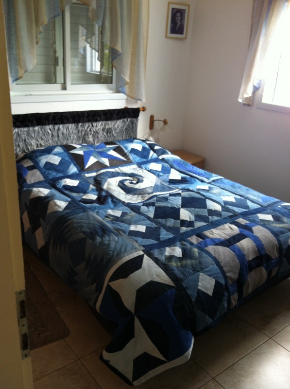 Это уже следующие 8 пар старых хлопковых штанов. Здесь и джинсы и штаны из хлопка с подкладкой. И еще лоскуты (большие) от штор после их укорачивания, плюс трофеи из лоскутных остатков Светланы (sv_div) (темные квадратики плотной шерсти или шерстяного пледа) - по периметру. Следующий снимок - изнаночная сторона. Квадраты серые с черным горошком - обратная сторона детских джинсовых штанов. Лицевая сторона этих джинсов - неинтересная темно серая окраска, а изнанка оказалась такой симпатичной. Разм...