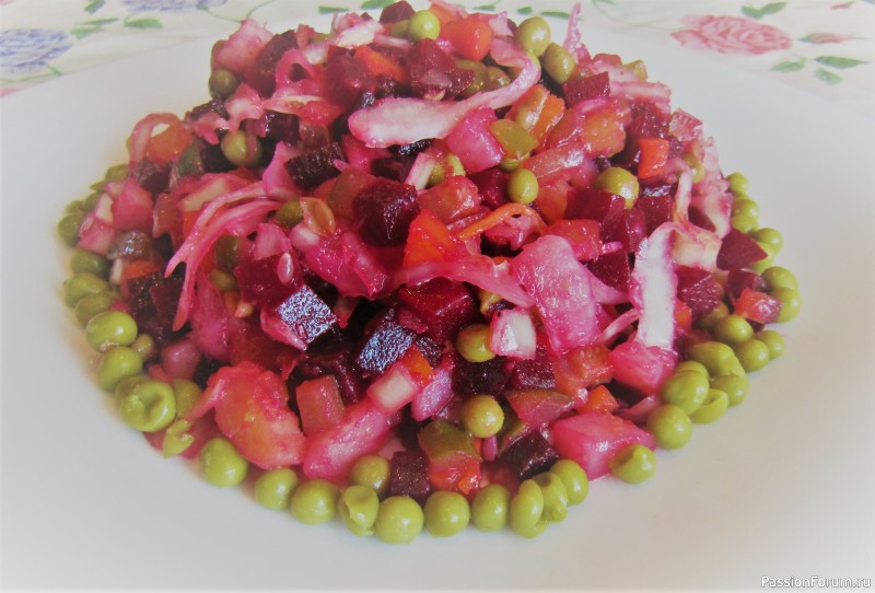 Винегрет – салат из отварных овощей, простой, но очень вкусный и полезный. Вариаций приготовления винегрета великое множество, представляю вам самый простой и быстрый рецепт. Ингредиенты: свекла – 2 шт.; картошка – 4 шт.; морковь – 2 шт.; лук репчатый – 1 шт.; огурцы соленые – 5 шт.; квашеная капуста – 300 гр.; зеленый горошек – 0,5 банки; растительное масло – 6 ст.л.; соль – 0,5 ч.л. Приготовление: Овощи помыть и приготовить любым удобным способом – отварить на плите, в мультив...