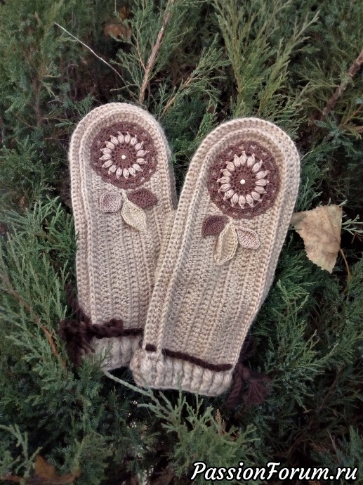 Здравствуйте! Связала теплые варежки крючком. Первая пара из двух половинок, вяжутся отдельно, потом сшиваются и украшаются вышивкой или вязаными элементами. На YouTube есть хороший МК по вязанию таких варежек. Вот только палец вязала столбиками без накида по кругу спиралью, мне кажется, так аккуратнее получается.