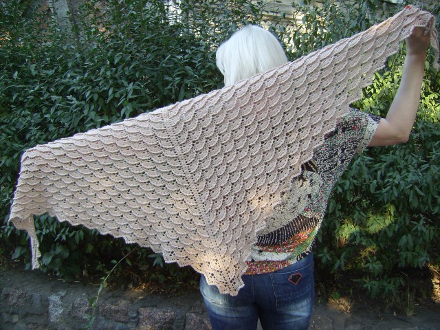 Шаль связана крючком,я назвала Веер.Шаль получилась очень мягкой,приятной к телу-пряжа меринос 1500м/100 г,вязала в две нити,цвет светлый бежевый.В последнем ряду(обвязка) веера изменила на СС2Н и вместо "пико"-витой столбик "клоунз".Размер 190/75 см,расход примерно 240г.Отлично драпируется вокруг шеи бактусом