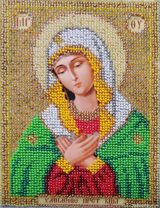Добрый день! Я недавно вышила икону бисером Богородица Касперовская. Набор от Русской искусницы. Оформила сама в раму. Мне кажется, что икона красивая получилась))
