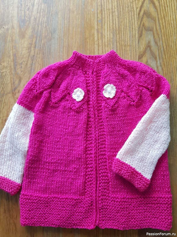Доброго времени суток, милые рукодельницы. Довязала кардиганчик на девочку-дюймовочку 2-х лет. Пряжа Alize Sekerim bebe, Герань №149 , в 100 граммах 320 метров. Спицы № 5, расход пряжи -90 грамм.Рукава из Alize Sekerim bebe, Кремовый №01 , расход пряжи грамм 15-20.