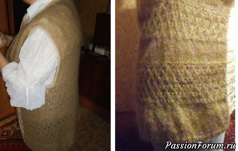 Жилеты любят многие, а дамы в возрасте - особенно, мне кажется :) Как минимум практично, тепло, удобно, уютно... а ведь еще и красиво бывает ;) Маме моей уже за 80, любит утеплиться, а жилет хорош еще тем, что надел под него разные блузочки, рубашки, водолазки - и выглядишь по-новому. Я связала его из мохера, ушло 4 мотка по 50 г, мохер очень тонкий. Отделка из испанской ангоры (дочь привезла как-то из поездки моточек в качестве сувенира, вот и пригодился). Основное полотно - обычная чулочная ...