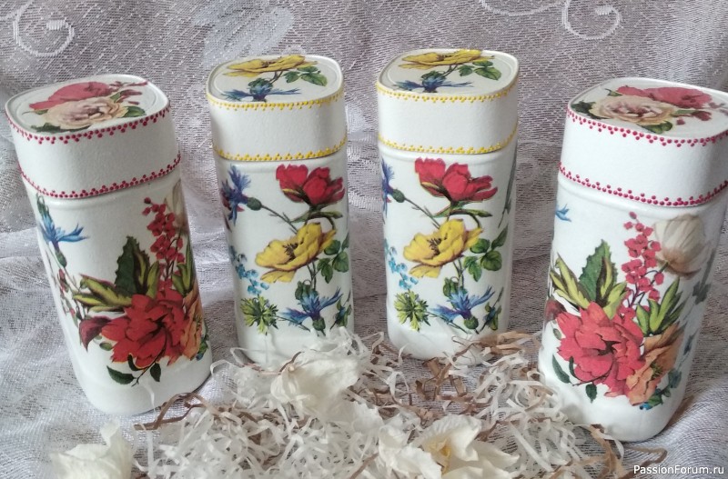 Доброго времени суток всем жителям форума!!! Я опять к вам с новыми работами... НАБОР БАНОК "ЦВЕТЫ" и ДАЧНАЯ ВАЗА "Я ПОДАРЮ ТЕБЕ ПОЛЕВЫЕ ЦВЕТЫ" Цветы, как люди, на добро щедры И, щедро нежность людям отдавая, Они цветут, сердца отогревая, Как маленькие теплые костры... (Ким Жанэ) В этом году каким то чудом у меня оказалось время на декупаж... Люблю декупаж, люблю работать с салфетками, обыгрывать их и составлять из них композиции, с распечатками у меня пока маловато работ, больше меня тянет к салф...